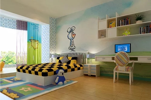 对于个性柔弱或是过于内敛的小孩,建议运用对比浓烈的色系,以达到激发神经发育的效果,而对于性格过于急躁的小孩,则宜采用淡雅的颜色,有助于塑造健康的心态,另外在装饰墙面时,禁止使那些狰狞怪异的形象和阴暗色调,否则会是小孩产生可怕联想,不利于身心发育。